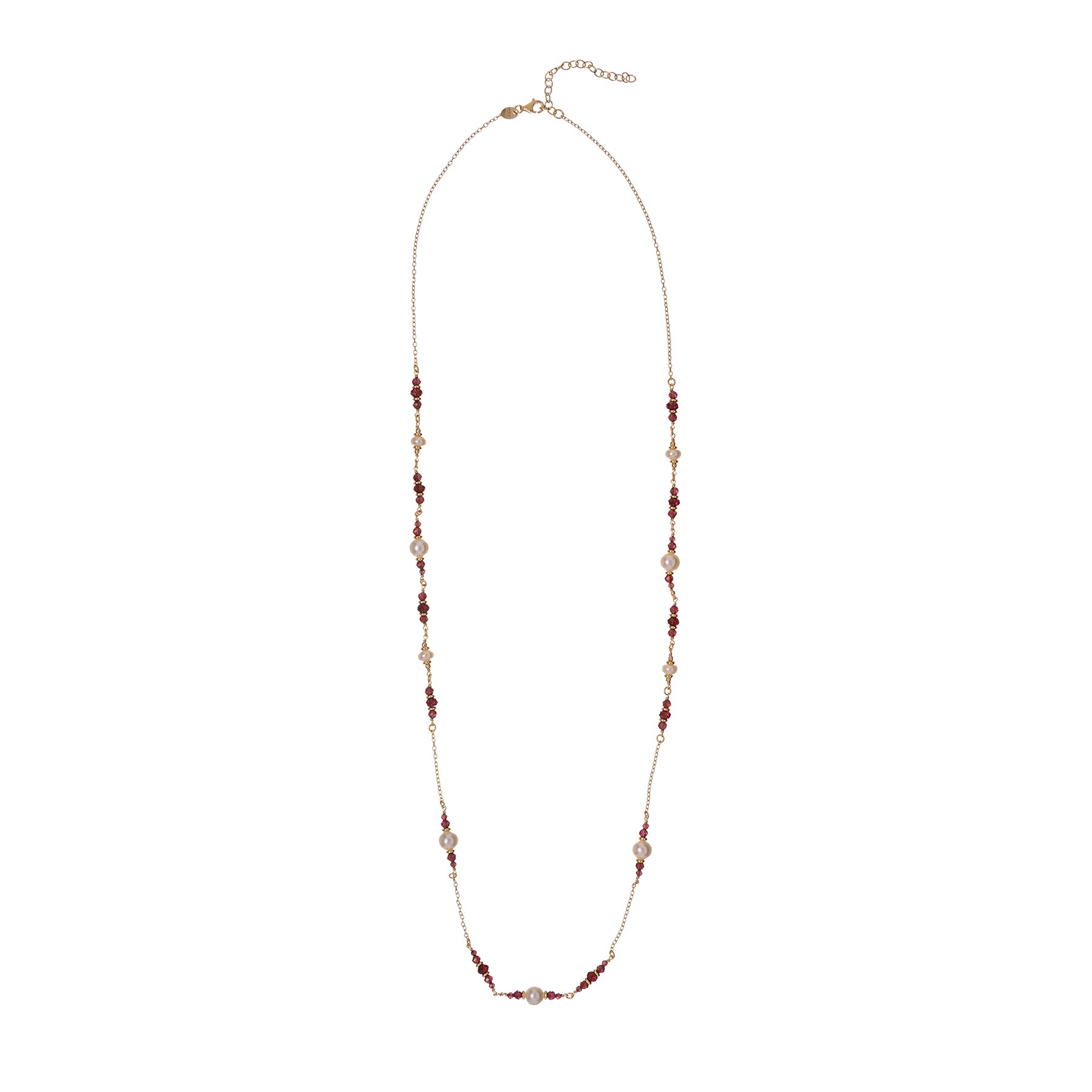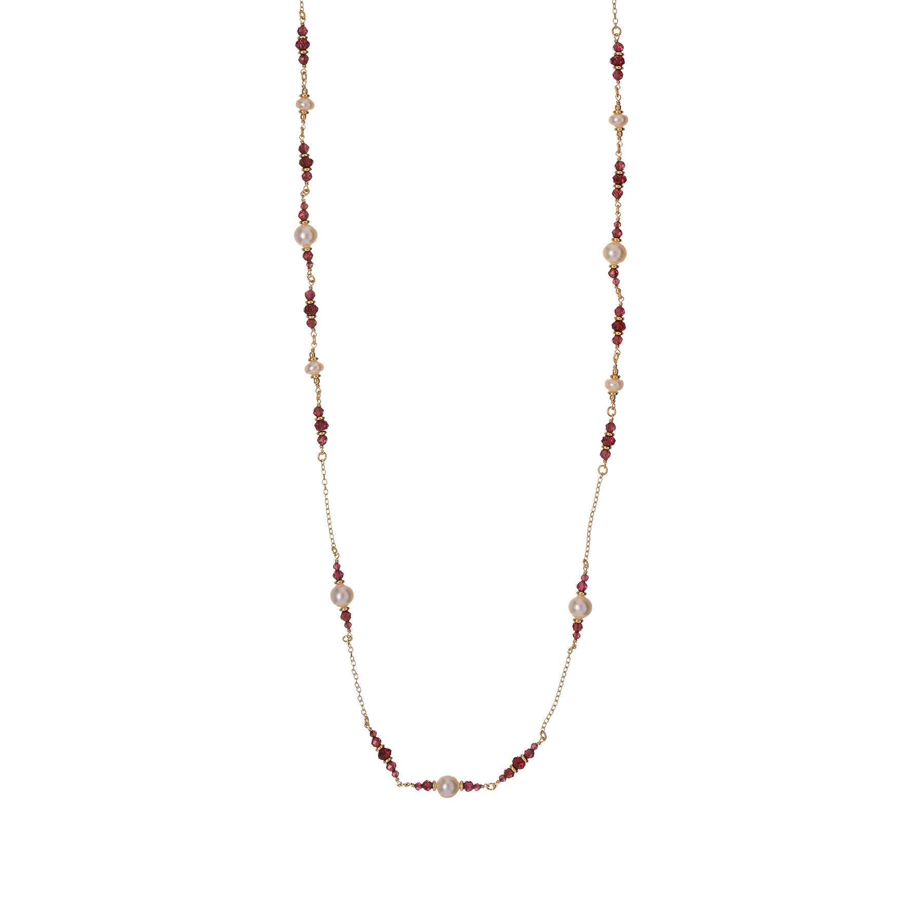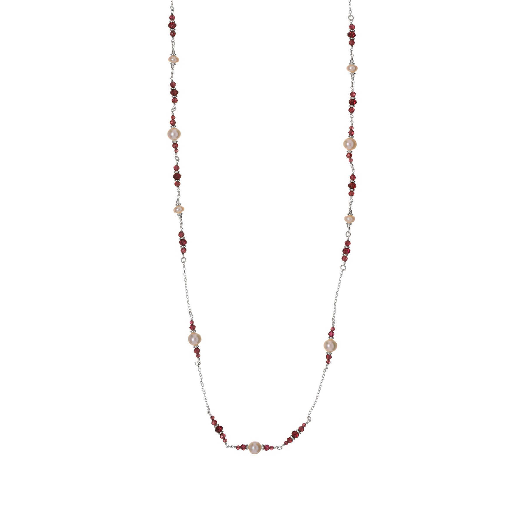 The warm tones of garnet combine with the purity of white pearls to create an elegant, timeless piece of jewelry.
